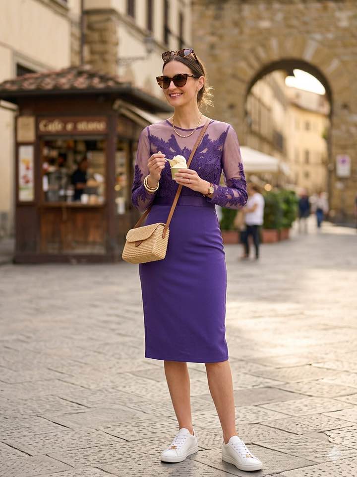 Le maniche lunghe in pizzo donano un tocco sofisticato, mentre il taglio pulito della gonna rende il look equilibrato e molto elegante.