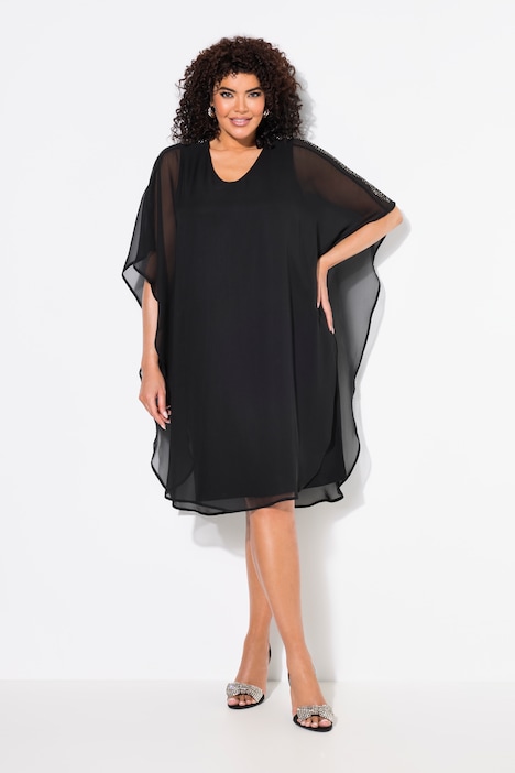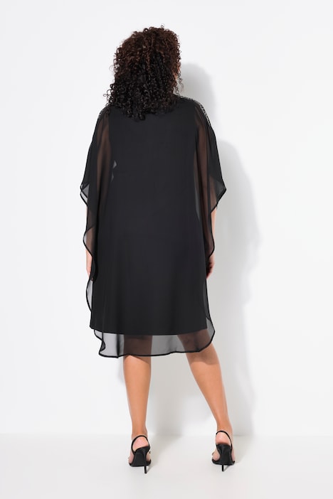 Abito nero in chiffon doppiato Ulla Popken da campionario, proposto in un solo pezzo nella taglia 48-50. Il design con effetto mantella, lo scollo a V e i piccoli punti luce sulle spalle lo rendono un capo elegante e scenografico, ideale per cerimonie, serate ed eventi in cui desideri un look curvy raffinato.