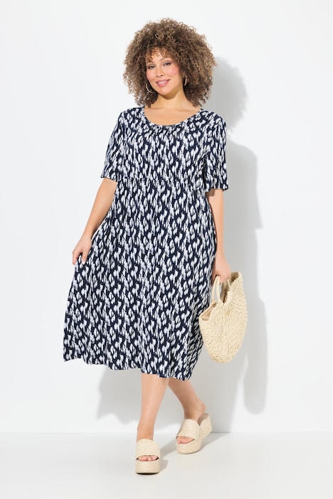 Abito midi Ulla Popken da campionario con fantasia grafica su fondo blu navy, ideale per chi cerca un capo curvy pratico ma ricercato per il quotidiano.