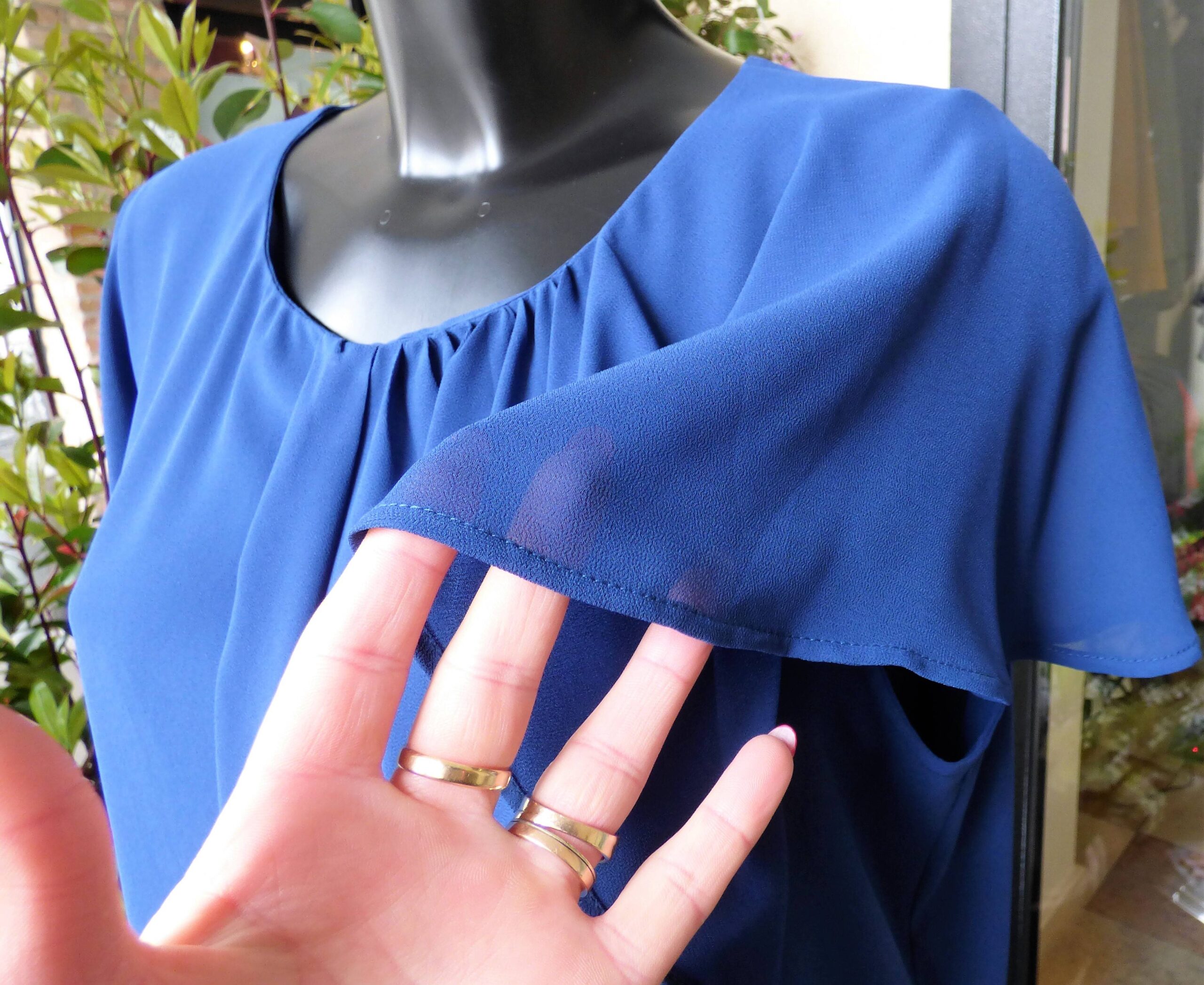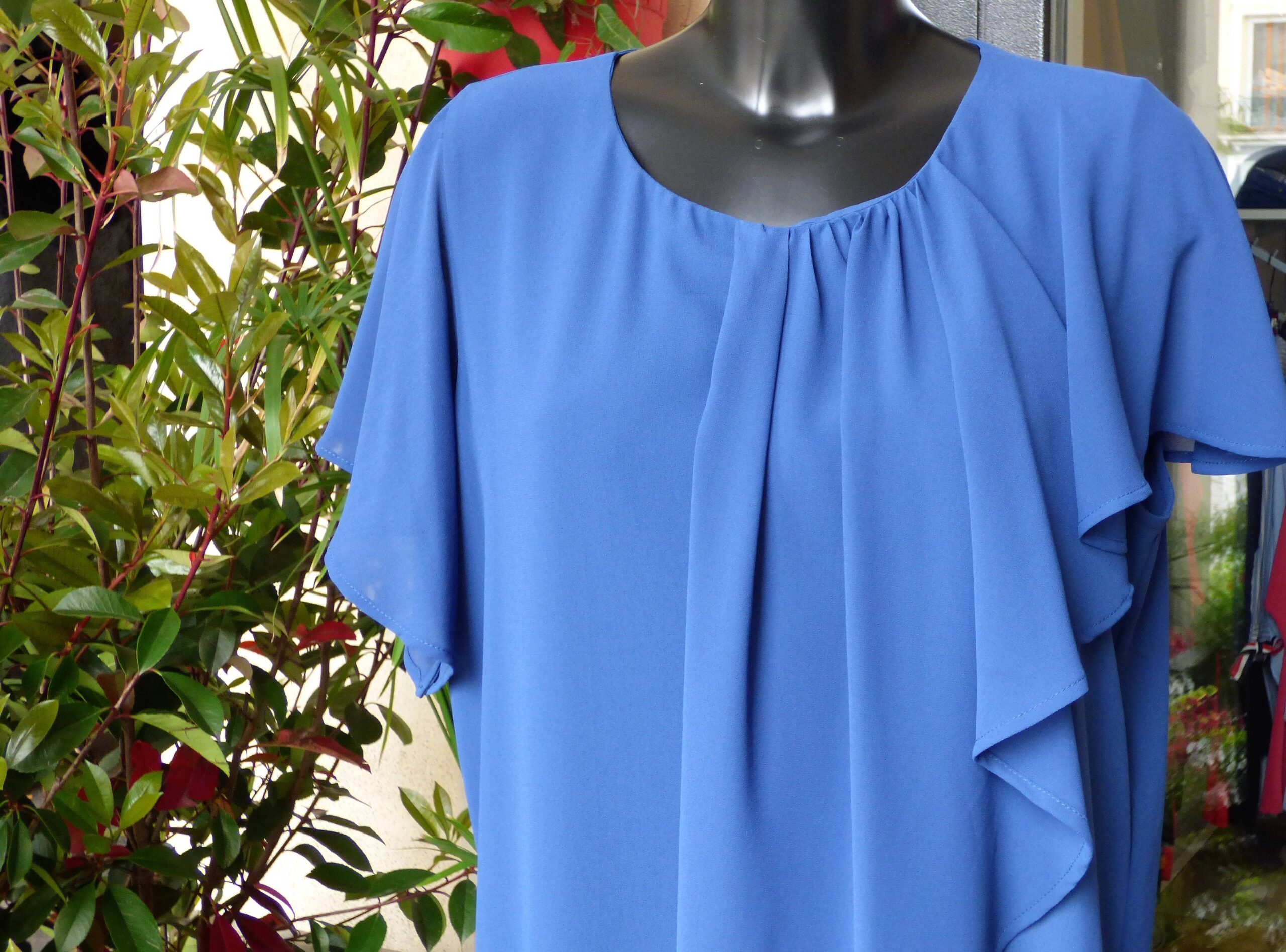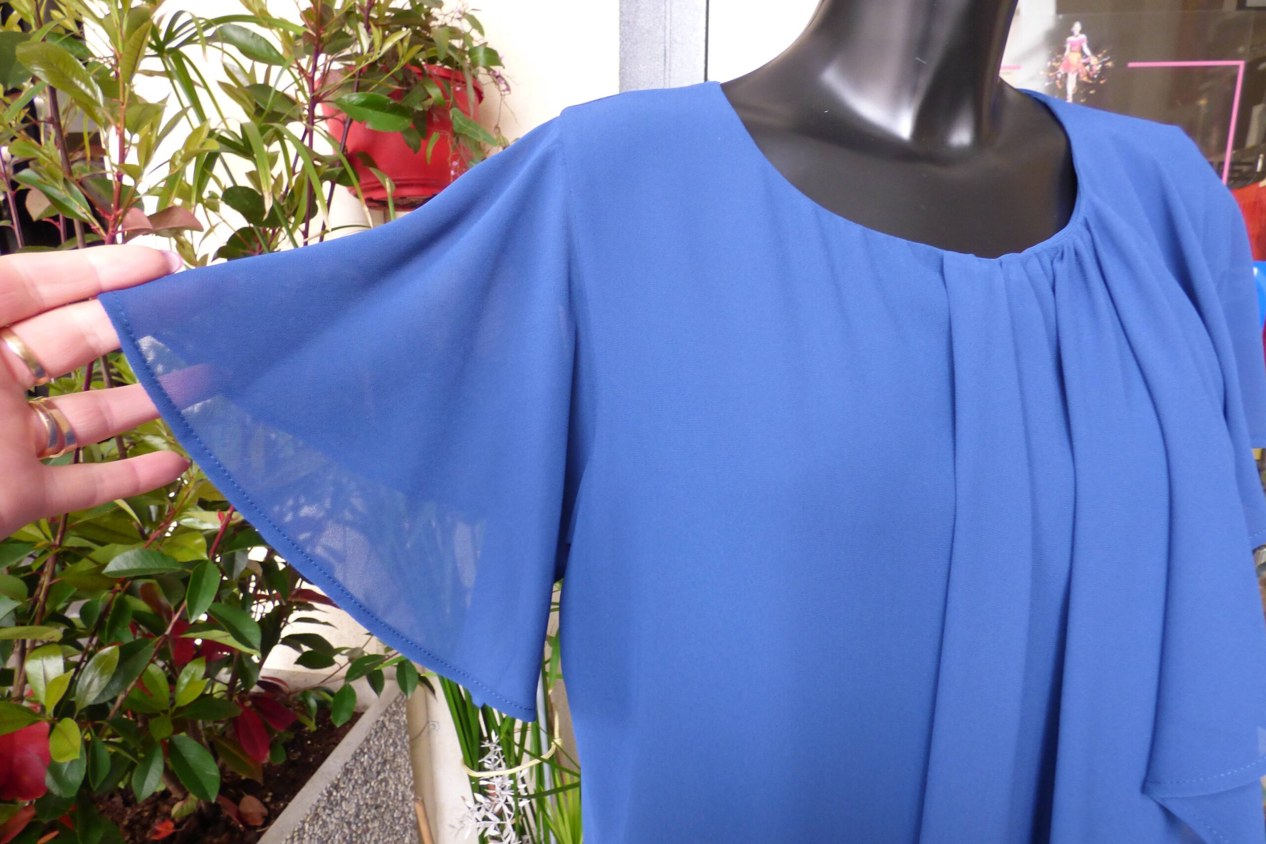 Il tessuto è un soffice chiffon, molto leggero ed impalpabile come una piuma sulla pelle, l’ideale per la bella stagione, la primavera e l’estate. La manica è corta e svolazzante.