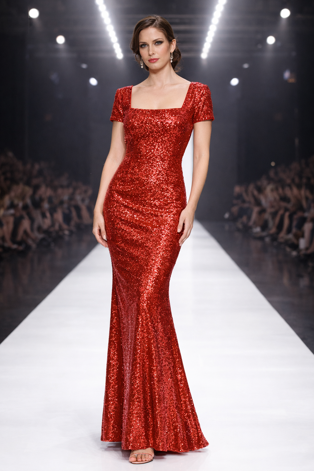 Il modello รจ lungo, con le maniche corte e la scollatura leggermente squadrata.