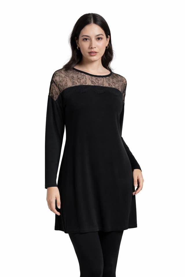 Descrizione: Lasciati avvolgere dal fascino senza tempo della nostra maxi maglia nera, che con un tocco di audacia si trasforma anche in un intrigante vestito corto. Firmata Liza Lu, questa creazione unisce la morbidezza del tessuto in maglia misto viscosa alla sensualità di un delicato pizzo francese, regalandoti un capo che gioca sapientemente tra la seduzione del vedo non vedo e il comfort di una vestibilità comoda e avvolgente.