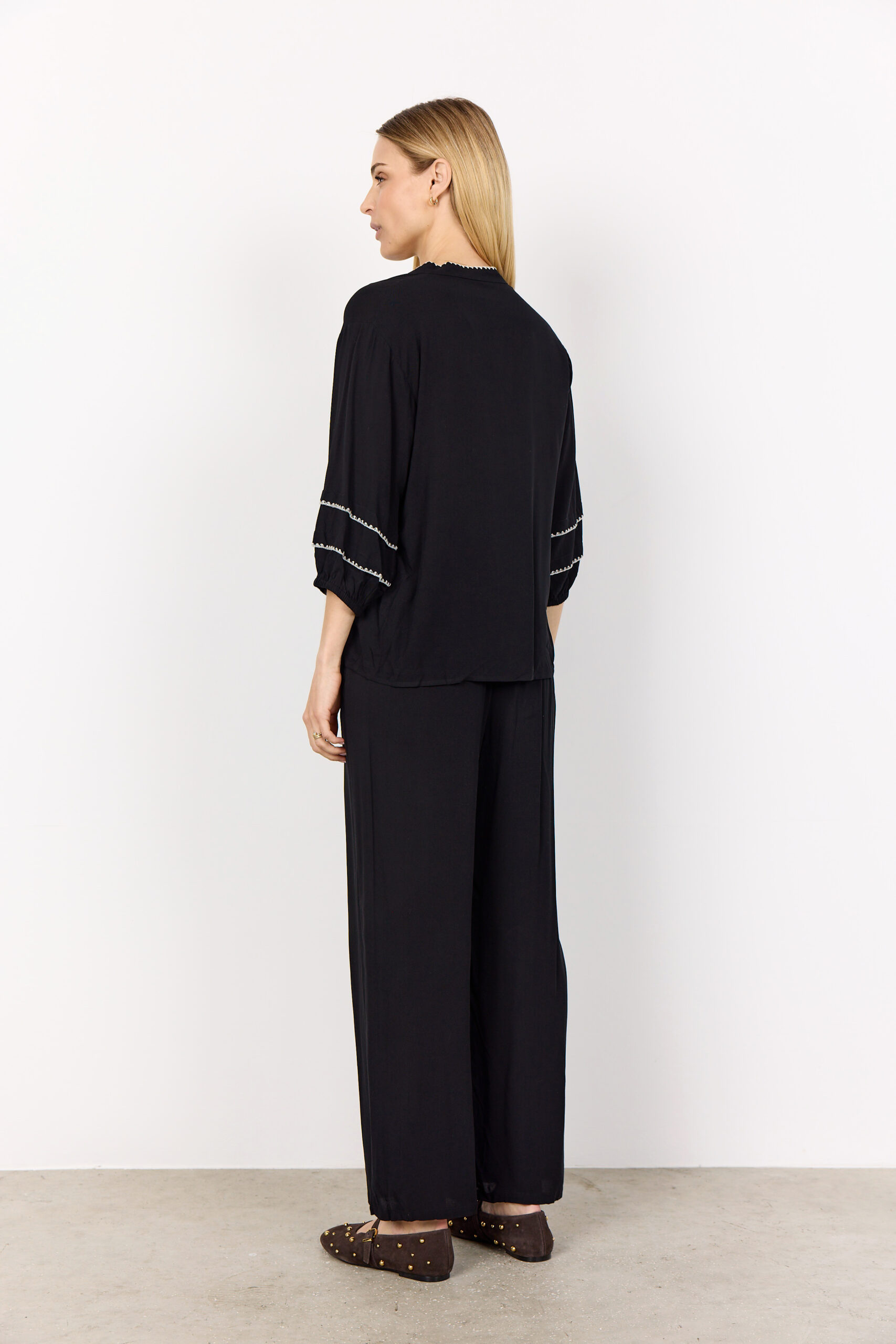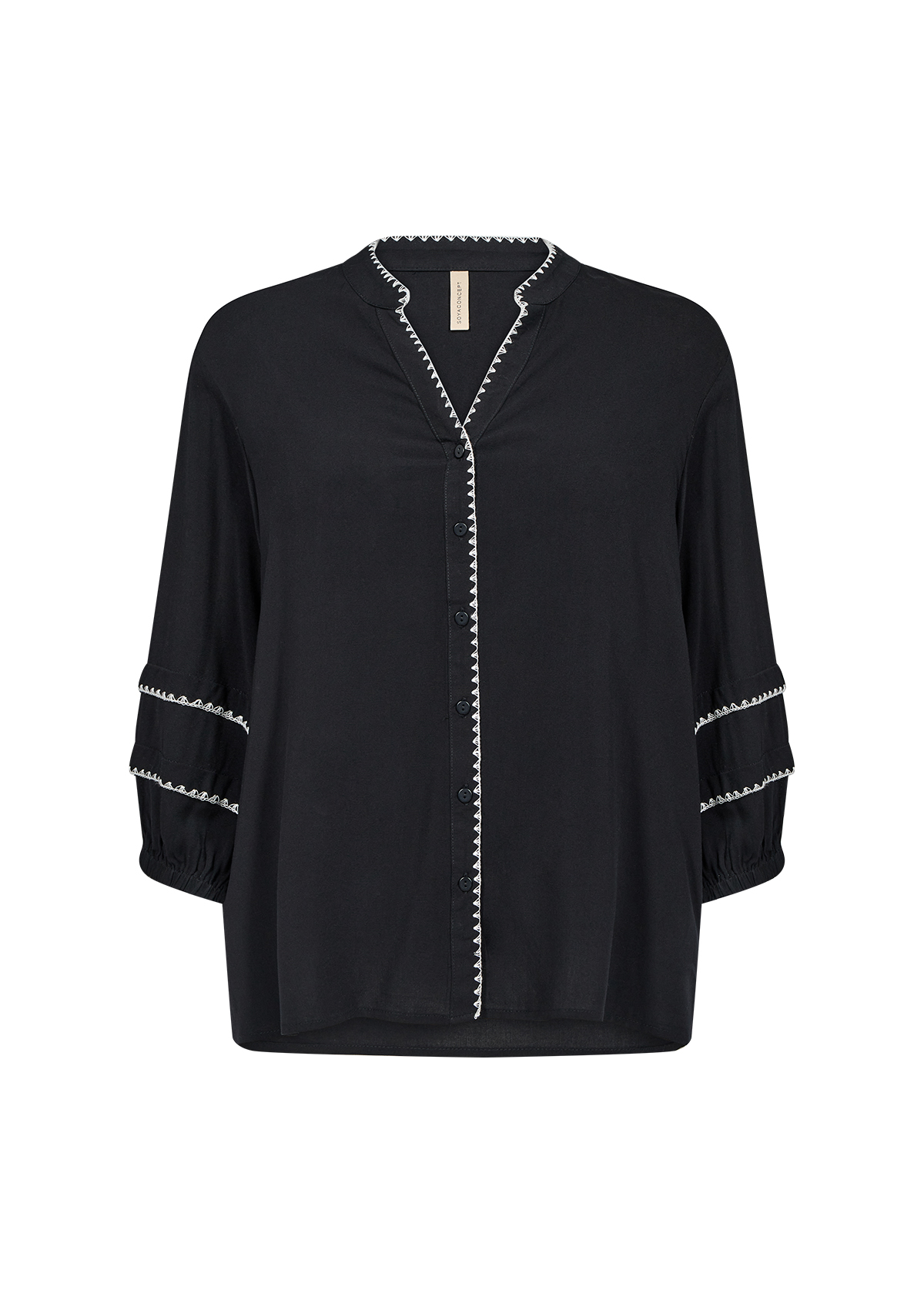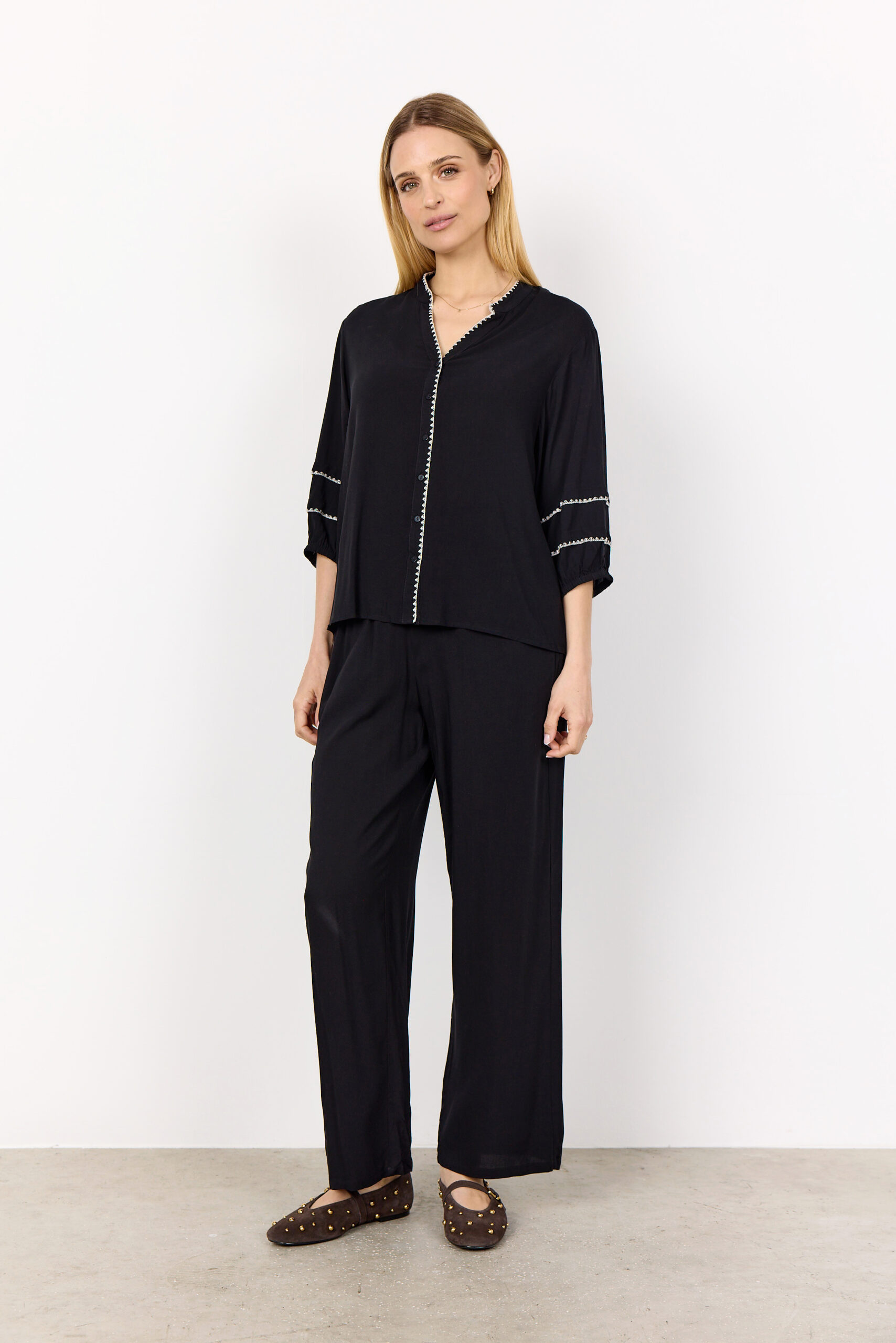 Il modello presenta un scollo a V rifinito con cuciture decorative, chiusura con bottoni e maniche a 3/4 arricchite da dettagli ricamati, che donano un tocco sofisticato. Versatile e chic, è perfetta sia con jeans per un look casual, sia con pantaloni sartoriali per un outfit elegante.