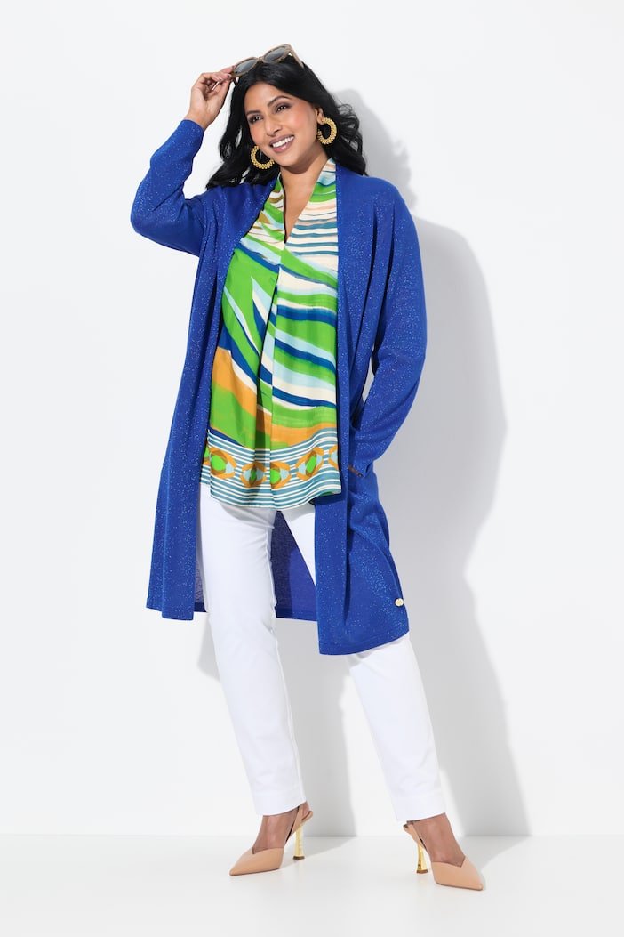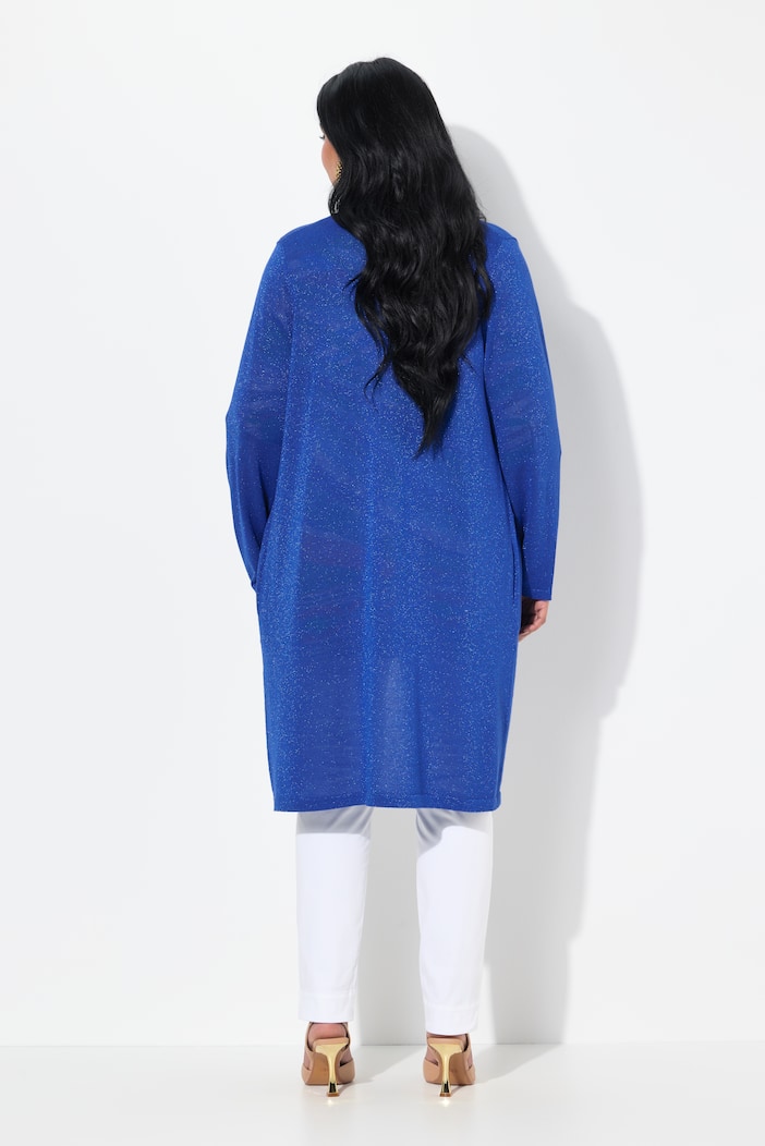Cardigan Ulla Popken da campionario in blu con filo lurex, ideale per aggiungere luce e movimento al look con una linea lunga e morbida.