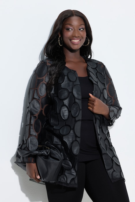 Giacca Ulla Popken da campionario in nero Black Beauty, dal forte impatto visivo grazie al gioco grafico tra mesh trasparente e texture morbida effetto pelle.