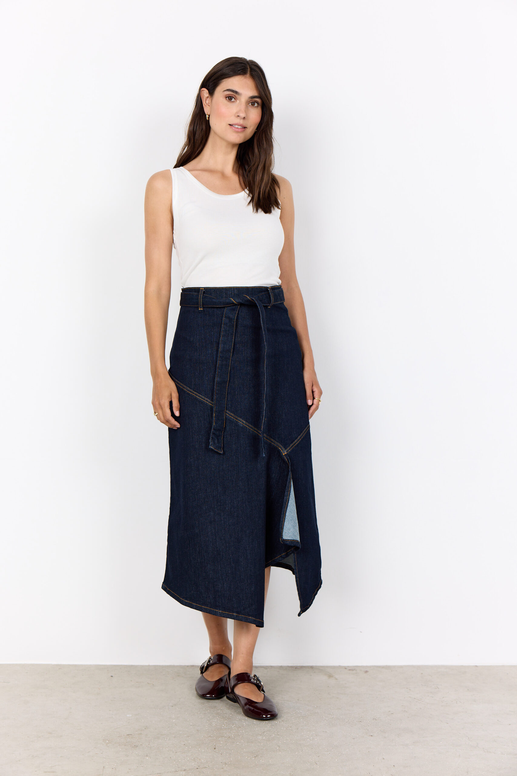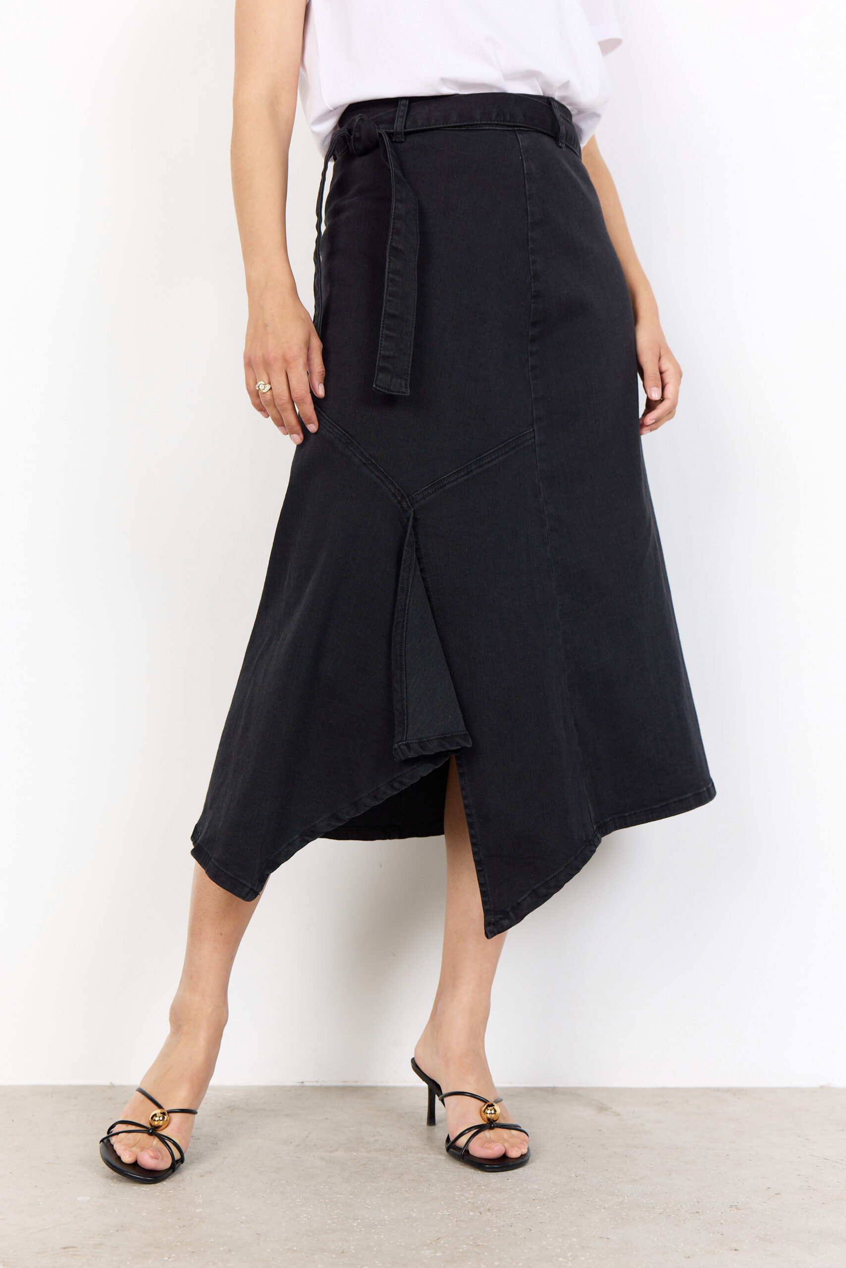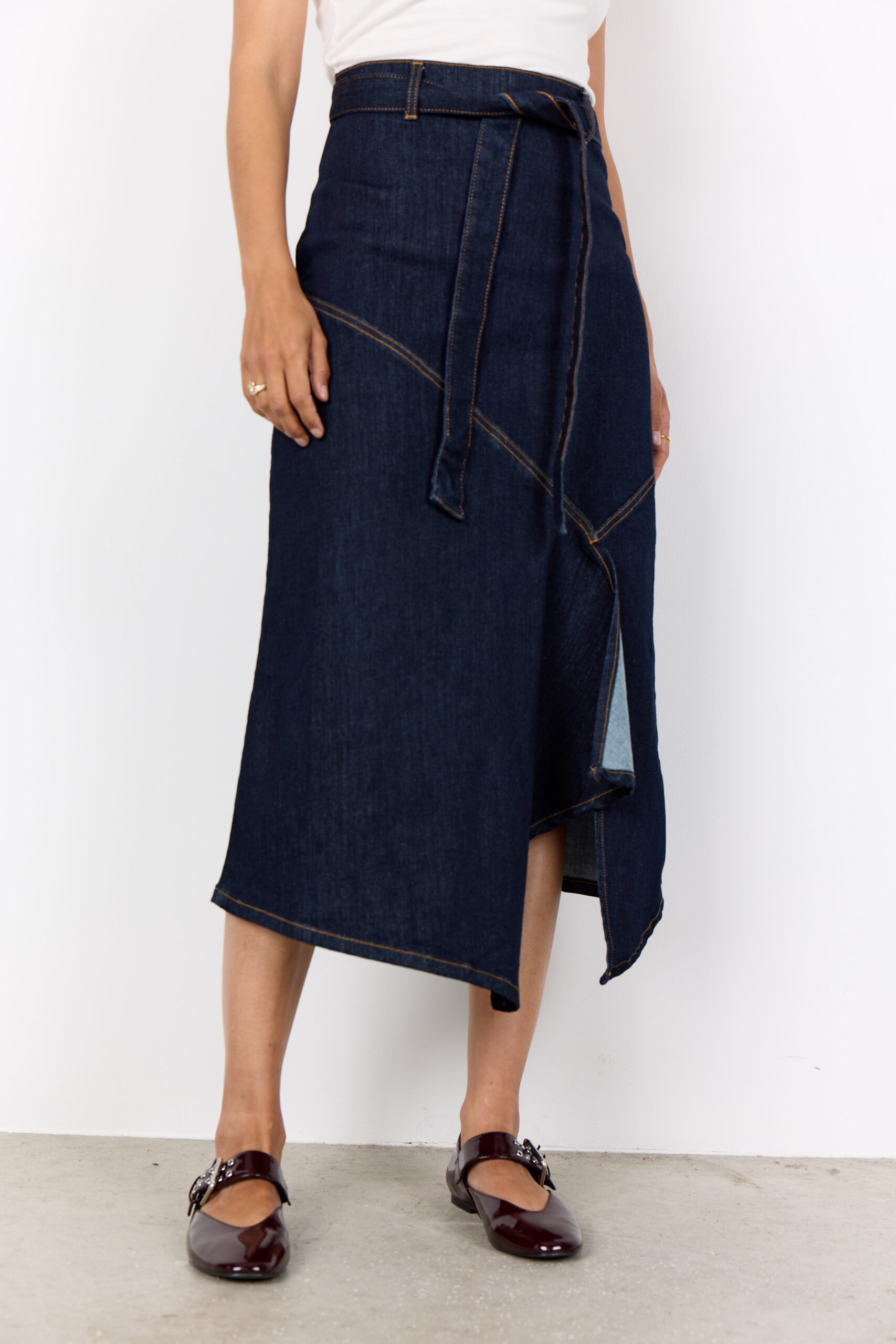 La gonna SC-Kimberly 40 unisce modernità e comfort in un capo versatile e femminile. Realizzata in 81% cotone, 17% poliestere e 2% elastan, è arricchita da una cintura regolabile in vita, una linea asimmetrica con spacco laterale e una pratica chiusura con zip sul retro.