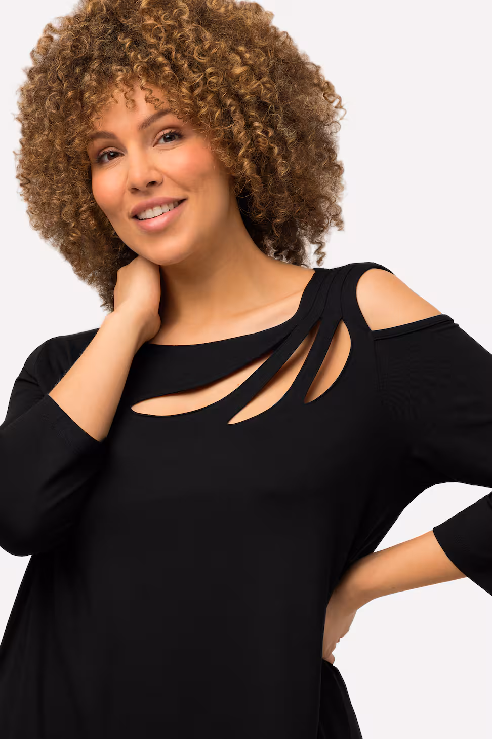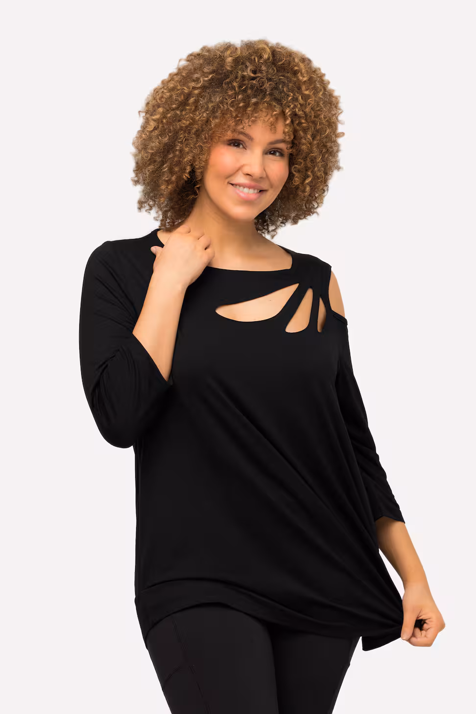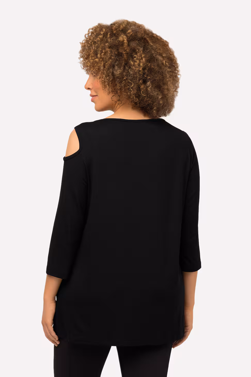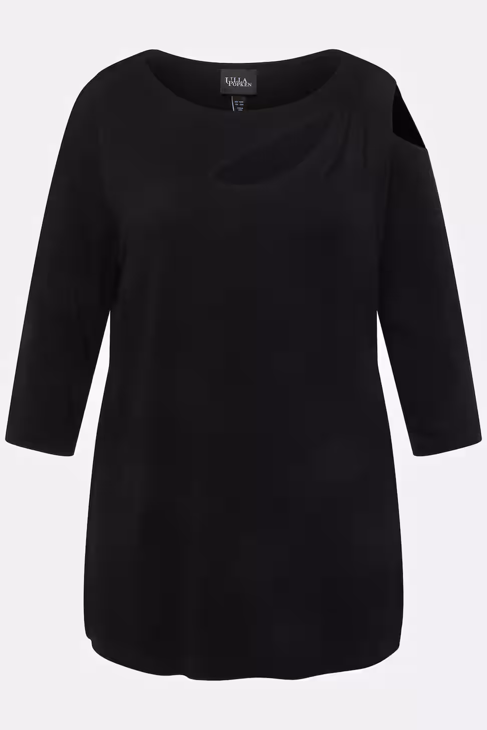 Lo scollo a barca sottolinea delicatamente le spalle, mentre le maniche a 3/4 e il tessuto in jersey di viscosa elasticizzato assicurano comfort, morbidezza e libertà di movimento.