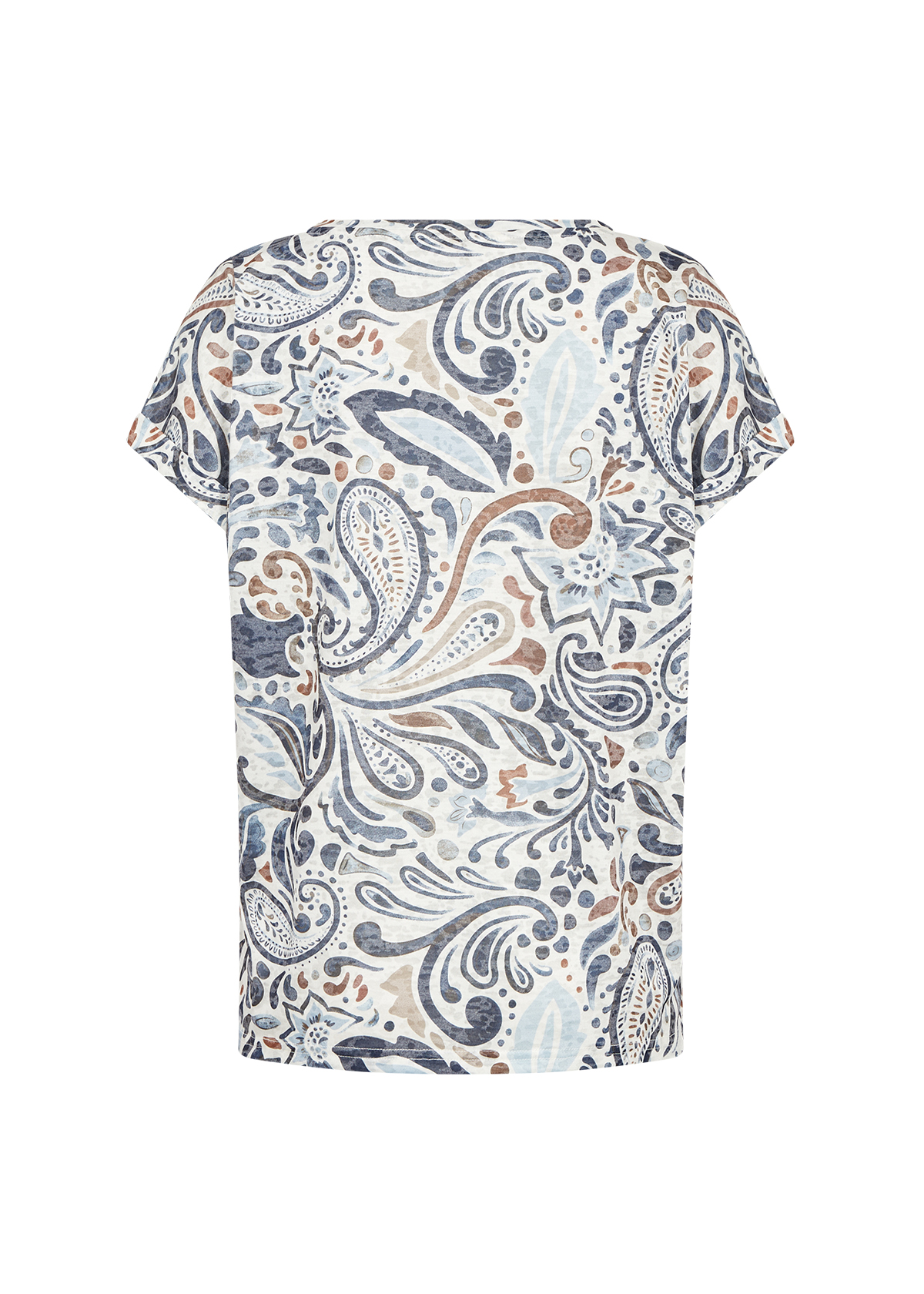 Realizzata in poliestere riciclato e viscosa, questa maglia combina comfort e attenzione all’ambiente. Il design è valorizzato da una raffinata stampa paisley che dona carattere al look, mentre lo scollo rotondo e le maniche corte la rendono perfetta per l’uso quotidiano.