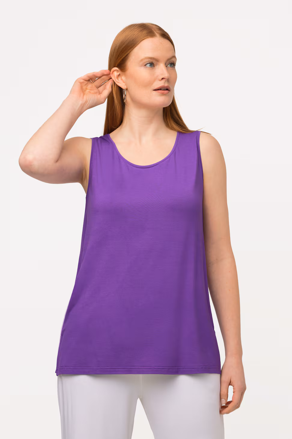 Questo top classico dal taglio smanicato è realizzato in morbido jersey di viscosa elasticizzata, per garantire comfort, morbidezza e libertà di movimento.