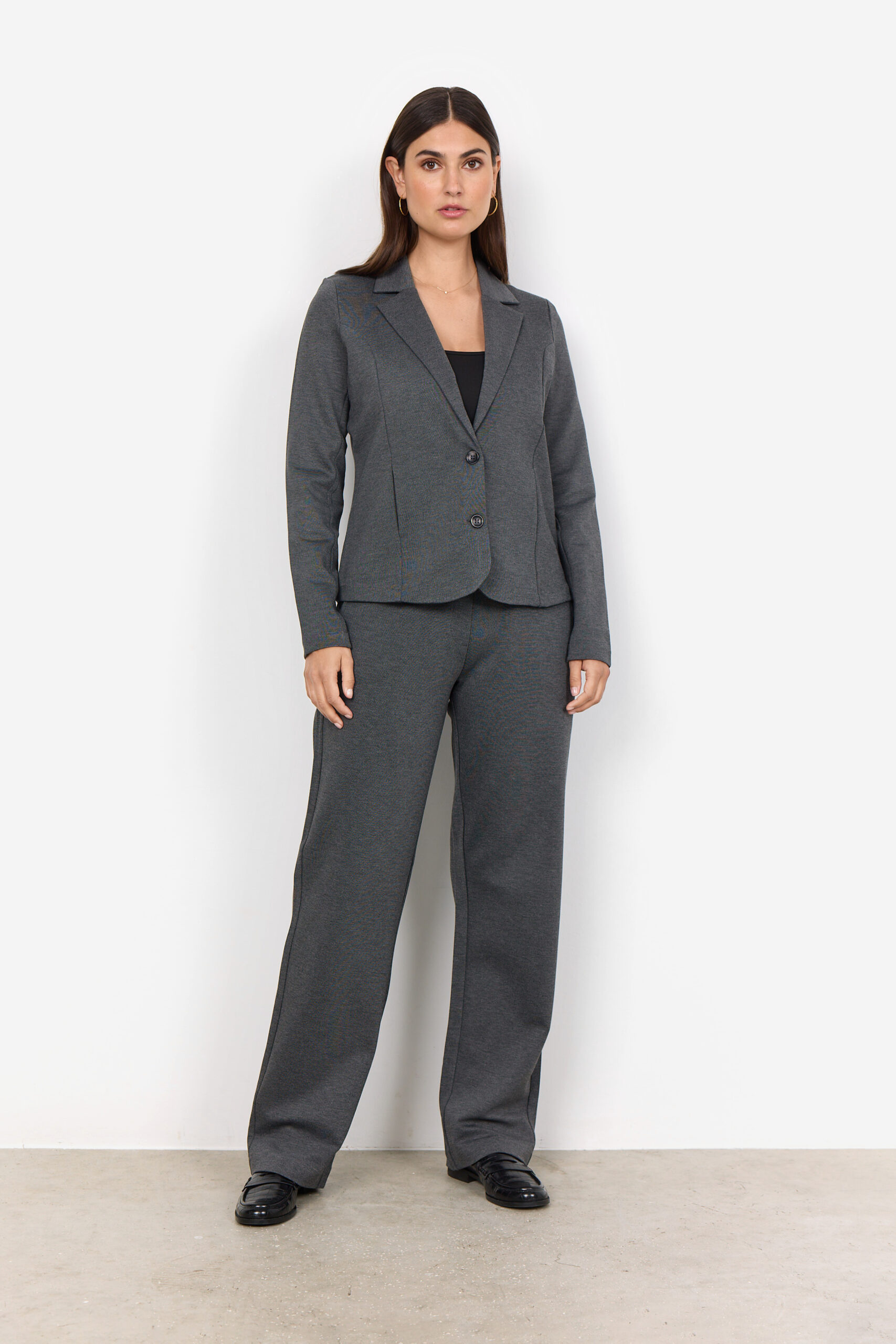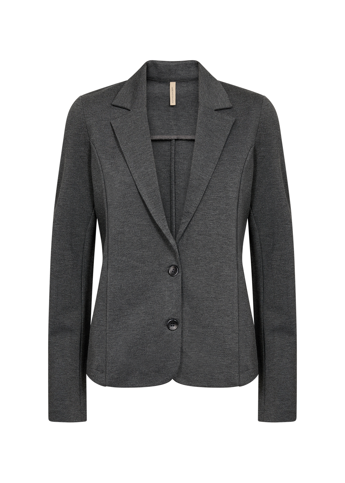 Parole chiave SEO: blazer grigio scuro, giacca donna elegante, blazer sostenibile, giacca ECOVERO™, blazer con tasche, blazer revers, abbigliamento donna chic, blazer taglie comode, moda ufficio donna.