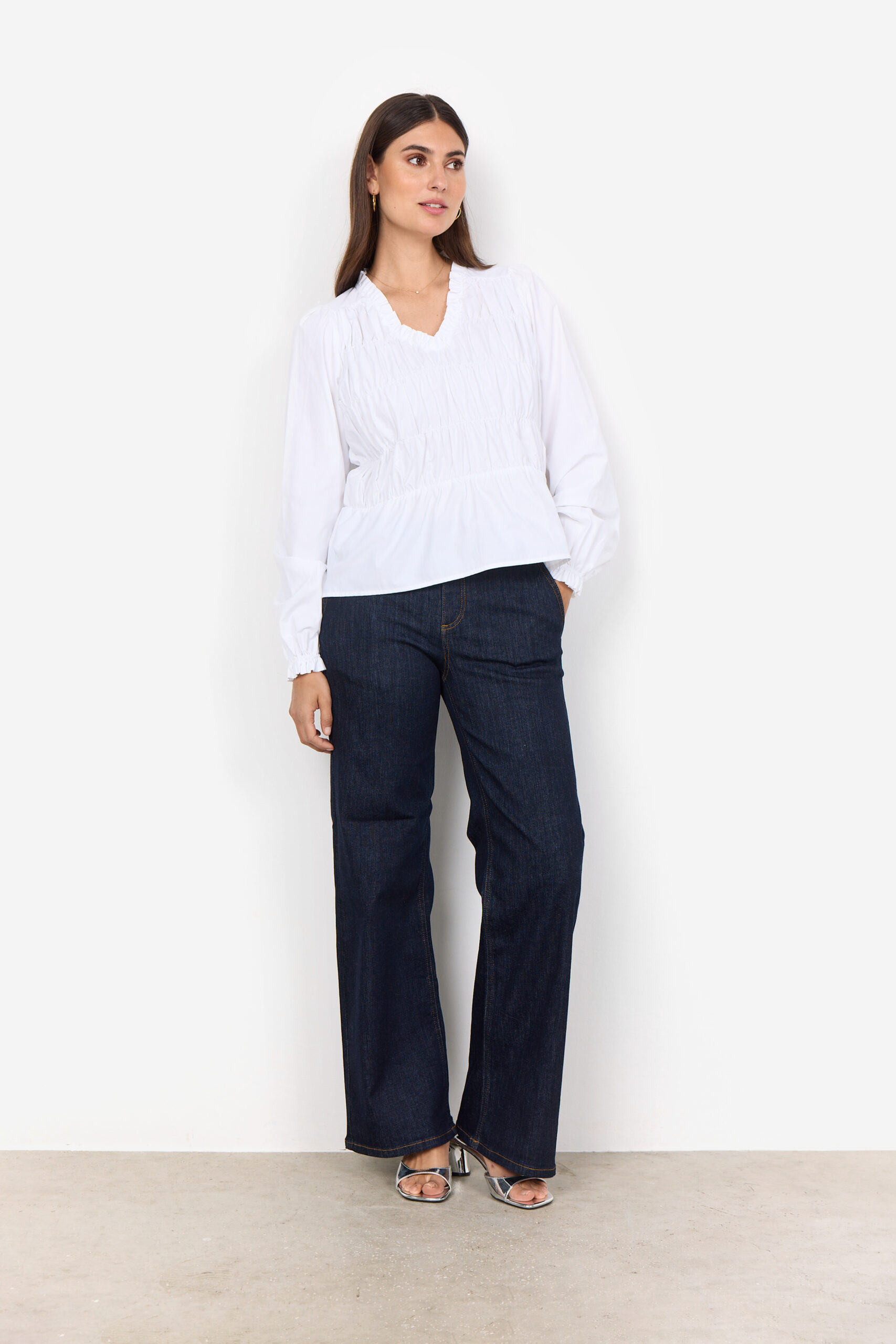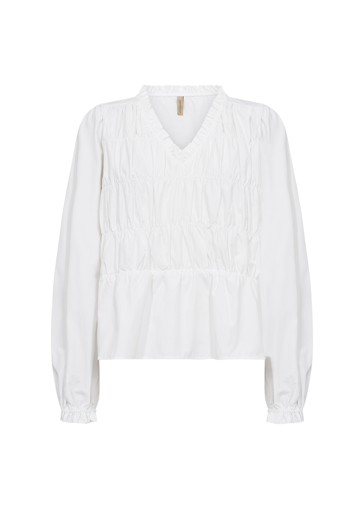 Il modello presenta uno scollo a V femminile, maniche lunghe, un design leggermente corto (cropped) e una morbida smock frontale che aggiunge volume e un tocco super chic al capo.
