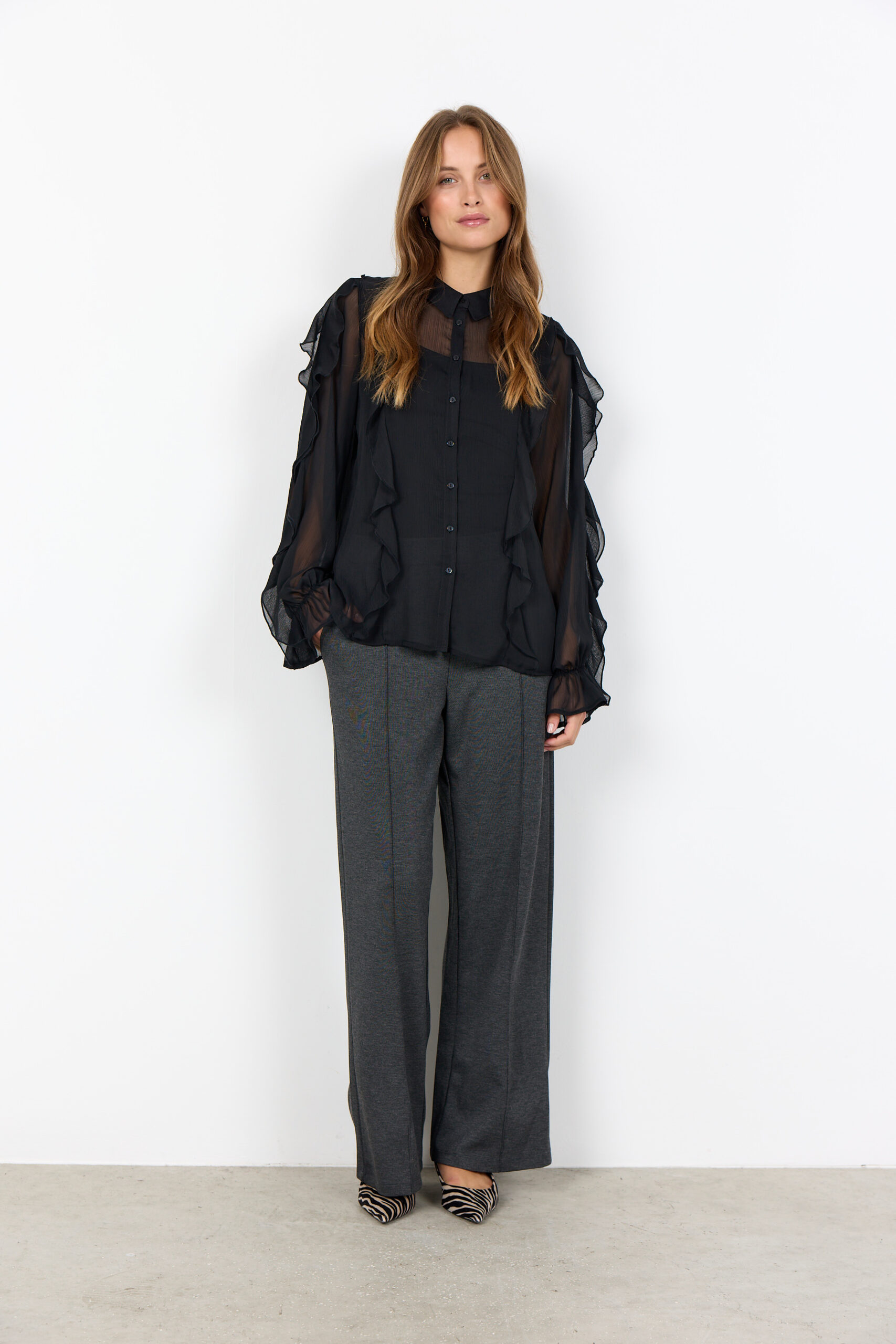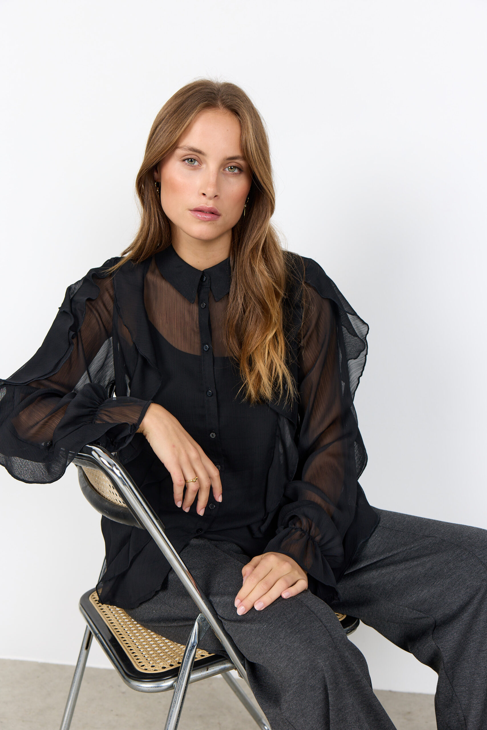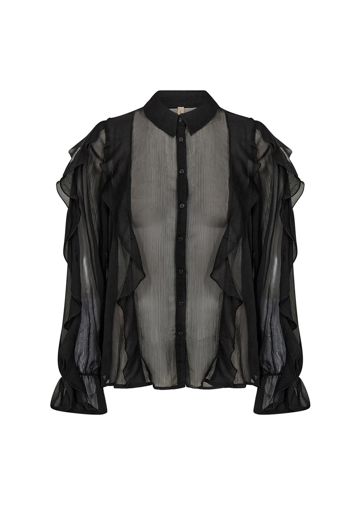 Le delicate rouches lungo la parte anteriore e sui dettagli del design rendono questa camicia perfetta per outfit eleganti, sia da giorno che da sera. Da abbinare a pantaloni sartoriali o a una gonna lineare per un look impeccabile.