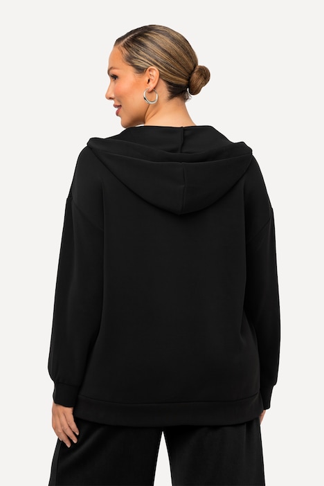 Felpa nera con cappuccio Ulla Popken da campionario proposta in un unico pezzo nella taglia 48-50. Il design essenziale e il tessuto morbido la rendono una scelta versatile per outfit casual curvy dall’aspetto pulito e contemporaneo.