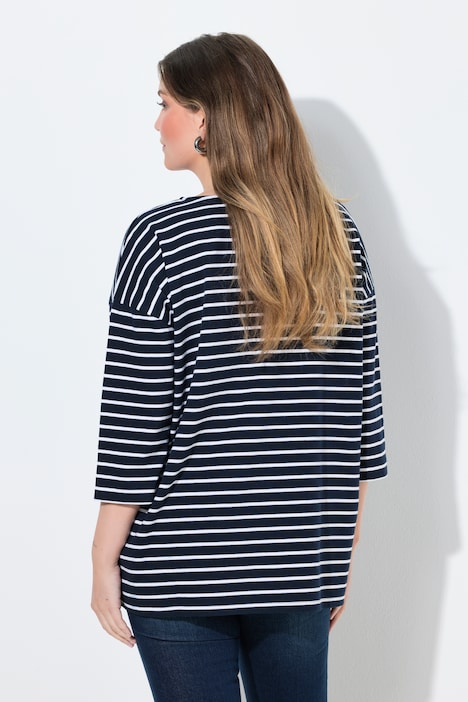 Maglia Ulla Popken da campionario in tonalita marine con righe chiare e ricamo floreale, perfetta per dare un tocco delicato al guardaroba curvy quotidiano.