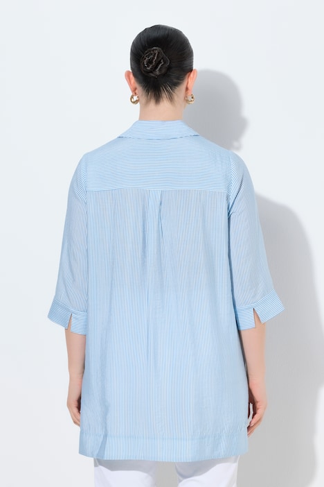 Blusa Ulla Popken da campionario con motivo a righe e stampa, proposta nella combinazione bianco e azzurro. Un capo luminoso, dal carattere fresco e contemporaneo.
